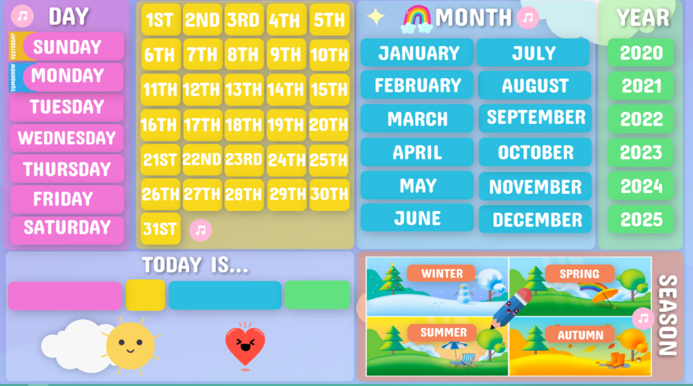 Il calendario digitale interattivo in ITALIANO e in INGLESE consente di mantenere la routine del calendario mattutino e non solo: grazie alle canzoni e ai video inseriti, propone ulteriori occasioni di apprendimento e approfondimento. NOTA BENE: Il pacchetto contiene il link all'applicazione (serve internet) e anche una cartella zip che contiene l'applicativo, utilizzabile senza connessione internet; tuttavia, per poter vedere i video di Youtube, è necessario disporre di una connessione. Si raccomanda di leggere il file con le semplici istruzioni d'uso, contenuto nel pacchetto.
