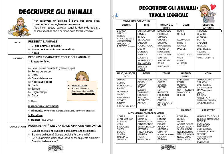 Due pagine: schema per descrivere gli animali e tavola lessicale
