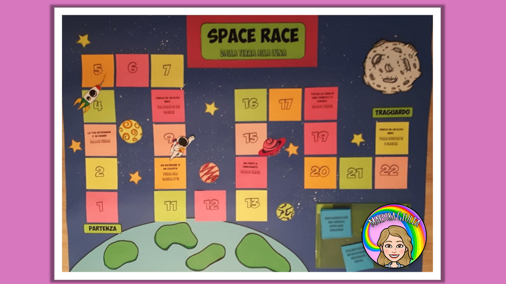 1. Il primo file contiene le caselle di gioco, gli elementi di decoro (stelle, pianeti, luna), il titolo e le targhette (partenza e traguardo), l'astronauta e il razzo (le pedine).